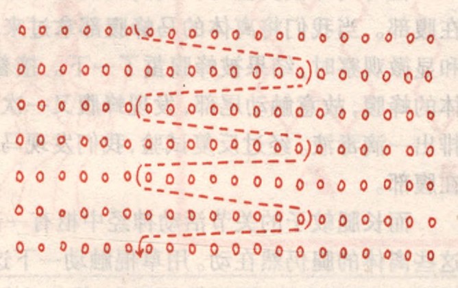第一步,可以两行为一组进行练习。笔尖从第一行顶端处向右下方虚画一条斜线(如上图),视觉的焦点随笔尖移动,余光看笔尖附近的一块文字。训练初,笔尖移动速度宜慢,意在掌握方法,要求切实看清上下两行文字。以后移动速度渐快,不但要求看清文字,而且要理解其意思,读后能讲出文章大意。第二步,可选报纸中的文章来练习,读前用笔画上斜线,不再借用笔尖指读,以斜线进行速读。用这种方法阅读,读速可达2000字/分以上。第三步,掌握了这种方法后,不需画斜线,仅以一条虚设的斜线进行速读。可以三行、四行……为一组进行练习,读速可达3000字/分以上。
