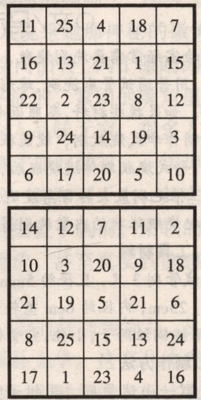 做一套(10张)舒尔特表,每张都画有25个方格。在小方格内无顺序地填上1 ~ 25这些数字,各张表的排列次序不同。全表为10 × 10厘米的正方形(如图)。