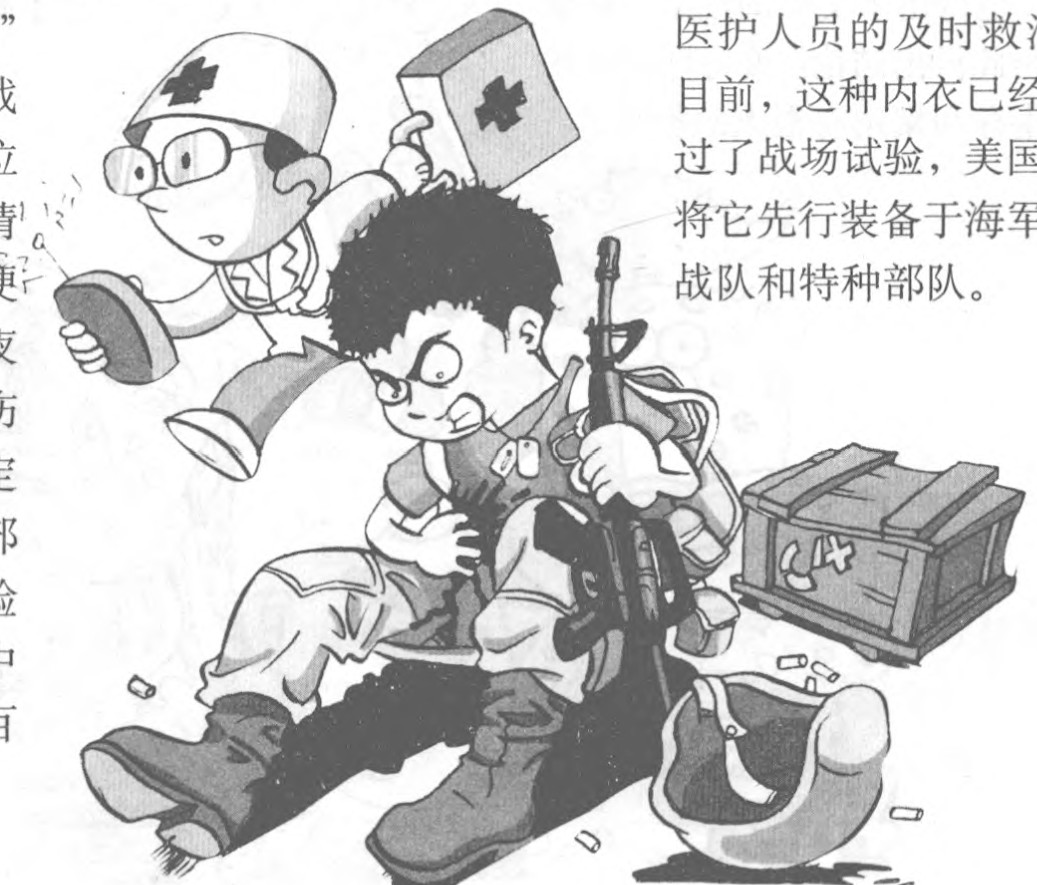 战场上人员受伤是常有的事,为了迅速查明伤员的伤情,以便有针对性地进行救护,美国研制出一种名为“智能内衣”的“伤情检测服”。它看上去只是一件极为普通的内衣,但其中却织入了光纤网络和导电聚合网络,并附有监视士兵身体状况的微型测量系统。穿着“伤情检测服”的人员在负伤倒地的一瞬间,其伤情便通过网络系统传送给远处的医护人员,医护人员根据所获得的信息,迅速准确地诊断出伤员受的是什么伤、伤在何处以及程度如何,并制定出救治方案。这样,伤员就可以在最短的时间内得到医护人员的及时救治。目前,这种内衣已经通过了战场试验,美国已将它先行装备于海军陆战队和特种部队。