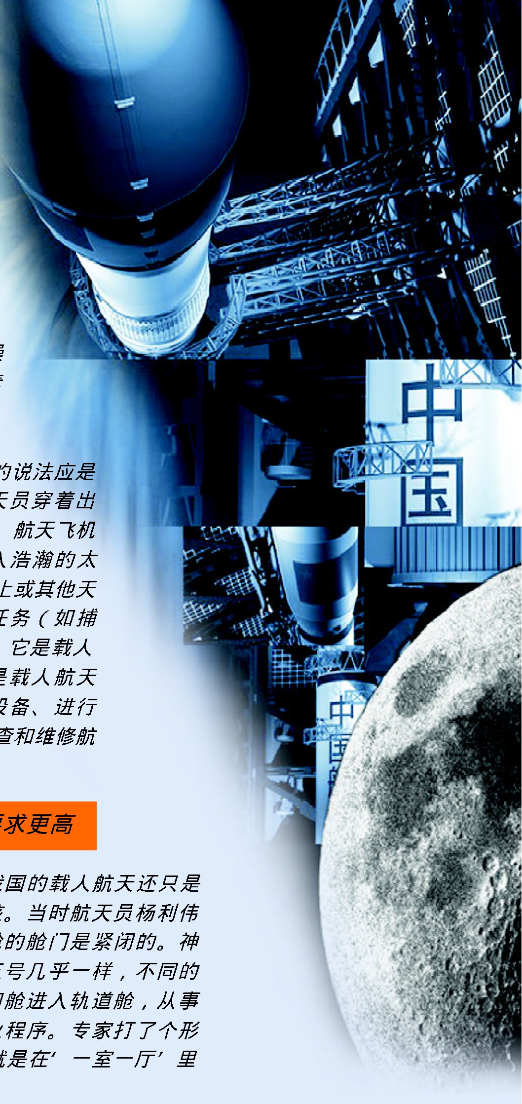 航天员出舱活动试验,就是航天员从新型的“神舟”飞船的密封舱出来进行太空行走。自1 9 6 5年前苏联航天员走出“上升2号”飞船在太空停留了1 2分钟后,至今美俄两国航天员共进行了近2 5 0次舱外活动,累计在舱外停留的时间达1 000多小时。