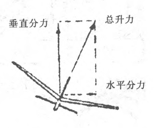 试飞左盘旋的飞机时,用右手的拇指和食指夹紧飞机尾部,让弹射钩钩住橡筋后,左手持弹射棒,手臂伸直,用劲向后拉,并使飞机右倾,即向人体“外侧”倾斜,弹射。盘旋半径小的,倾斜角可以适当加大,反之应减小。预设的右倾斜角,将升力分解成一个向右的水平分力和一个向上的垂直分力(如右下图)。向上的垂直分力克服重力使飞机上升,它小于机翼产生的总升力,能有效的消除飞机在高速爬升阶段的拉翻现象;向右的水平分力克服飞机本身的左转力矩,能有效的消除飞机在高速爬升阶段因为滚转在改出时出现的倒飞、侧飞现象,使模型平稳地盘旋上升。飞机弹射时倾斜角的大小最终还需要根据飞机改出时的状态再适当作点微调,使飞机爬升到最高点后,顺利改出,平稳地“坐”着开始左盘旋滑翔。