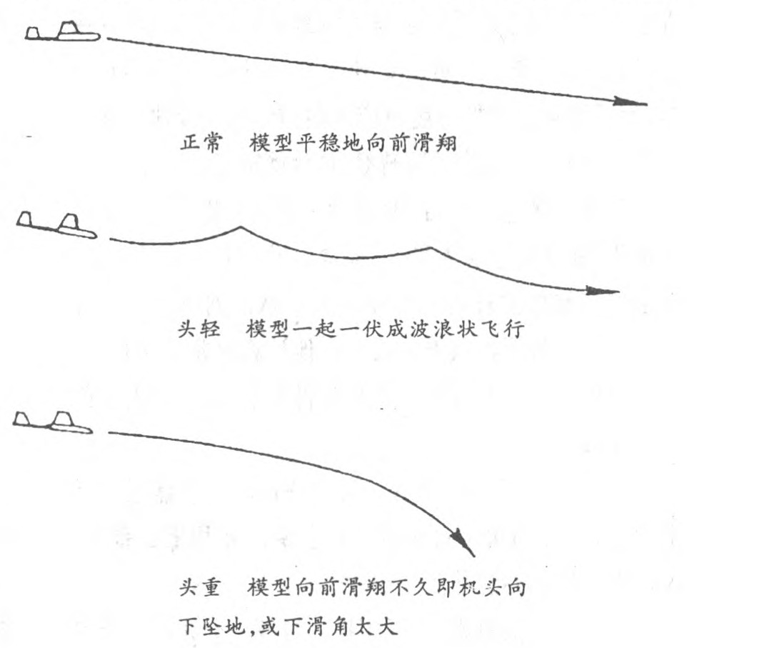 一架刚制作好的飞机,要先手掷试飞,观察飞机的飞行状态并相应调整其重心位置。具体做法是:手拿着机翼下方,举过头,让机头水平略微向下,稍用劲将飞机迎风投出。若飞 机一起一伏呈波浪状飞行,表明飞机抬头力矩较大,俗称头轻,应在机头配重或机尾减重。若飞机 向前飞行不久就机头向下坠地,或下滑角太大,表明飞机低头力矩较大,俗称头重,可在机头减重或机尾配重。正常飞行状态应该是:飞机机身有个很小的下滑角,缓慢平稳滑翔着。