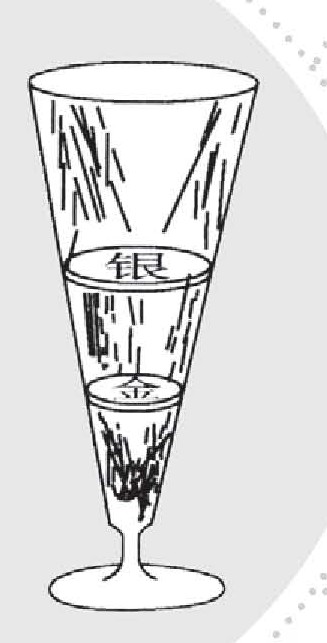 有一次,国王把一块金币和一块稍大的银币放在葡萄酒中(如图所示),对囚犯说:“你们谁能不用手或其他工具,从杯中取出金币,我就给谁自由。”请想想,有什么好办法?