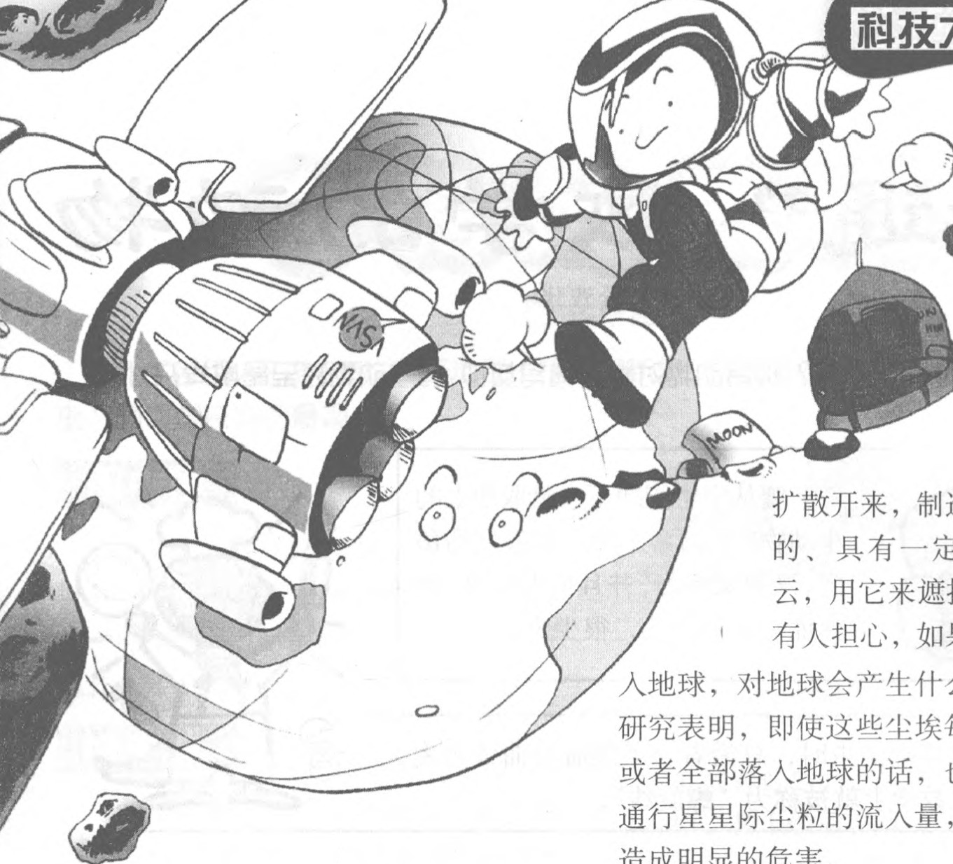 随着二氧化碳和其他温室气体增加而加剧的温室效应,使地球表面温度升高,全球气候变暖。地球“发烧”的直接后果是使冰川减少,海平面上升,大量低地和沿海岛屿可能被海水淹没,从而危及城市、村庄和农田。宇航科学家设想:如果在位于地球至太阳距离的1%处的某点位置上,漂浮着一片尘埃云,就可以用它来遮挡太阳光。“制造”这片尘埃云所用的尘埃可以取材于月球。把装有月球尘埃的若干个圆筒反射到空间某个位置上,在每个圆筒内装上炸药,当圆筒抵达规定的位置时,让炸药爆炸,依靠炸药的爆炸力使尘埃扩散开来,制造一片永久性的、具有一定密度的尘埃云,用它来遮挡阳光。但也有人担心,如果这些尘埃坠入地球,对地球会产生什么影响?科学研究表明,即使这些尘埃每年散失1%,或者全部落入地球的话,也只相当于普通行星星际尘粒的流入量,不会给地球造成明显的危害。