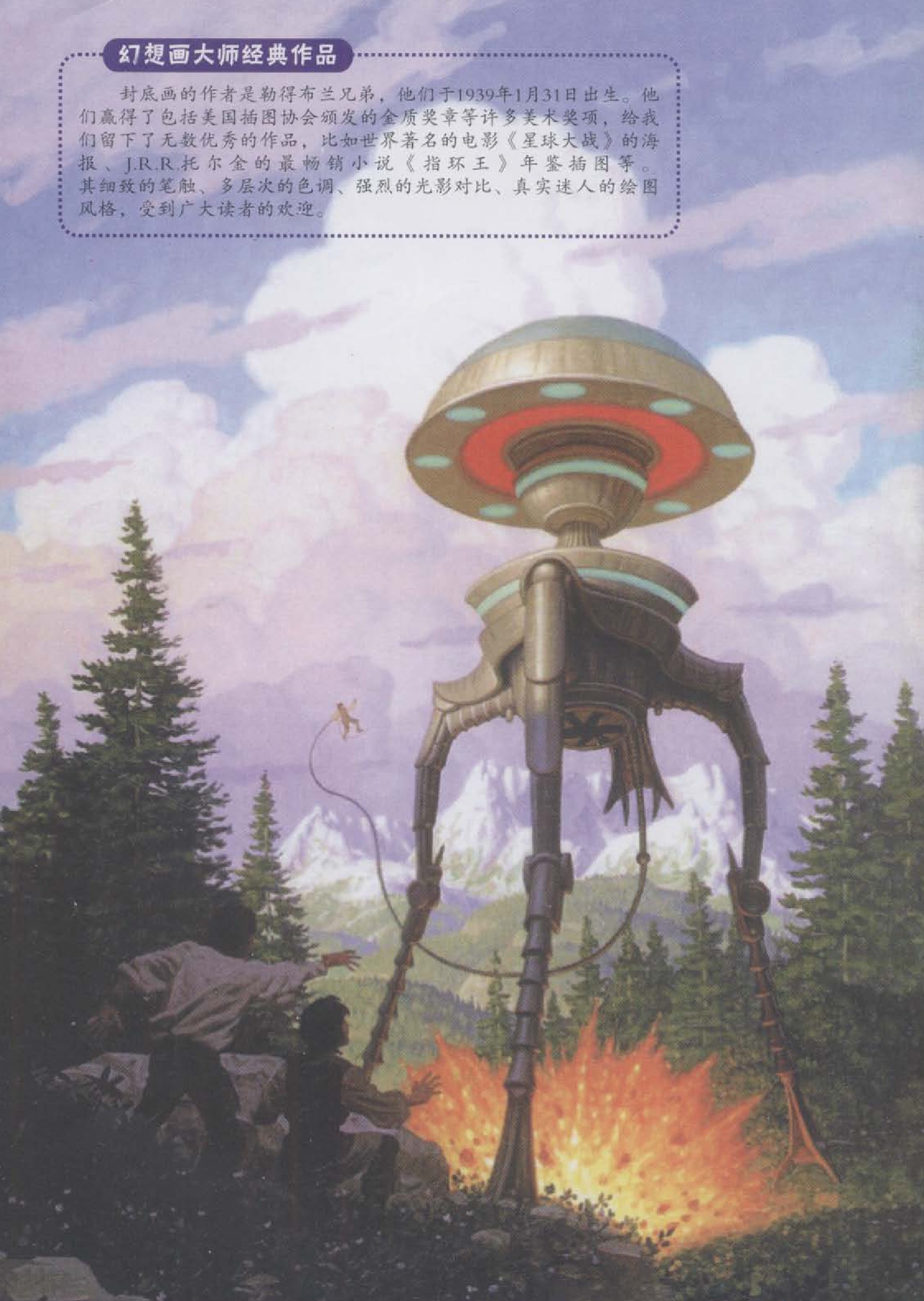 封底画的作者是勒得布兰兄弟,他们于1939年1月31日出生,他们赢得了包括美国插图协会颁发的金质奖章等许多美术奖项,给我们留下了无教优秀的作品,比如世界著名的电影《星球大战》的海报、J.R.R.托尔金的最畅销承说《指环王》年鉴插图等。其细致的笔触、多层次的色调、强烈的光影对比,真实迷人的绘图风格》受到广大读者的欢迎。