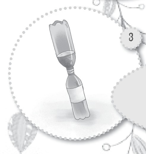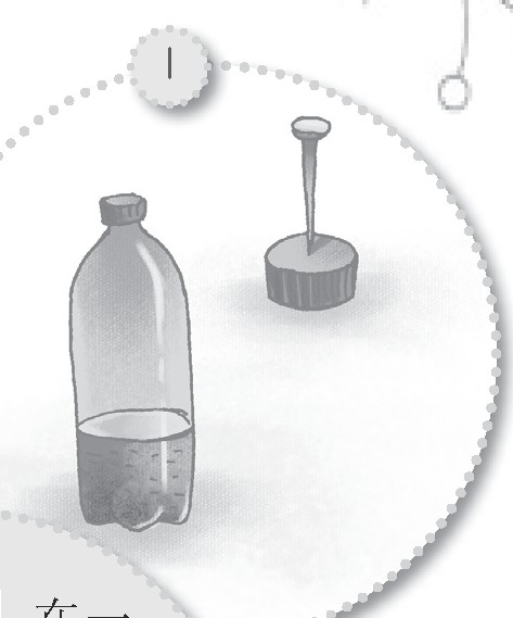 只见哥哥从储物柜里翻出两个可乐瓶,一个有盖儿,一个没盖儿。然后在没盖的瓶子里装一小部分水,又用钉子在另外一个瓶子的瓶盖上扎了两个孔,豆丁正纳闷为什么要在盖儿上打孔的时候,哥哥已经将打孔的可乐瓶倒扣在装水的瓶子上了,而且还用胶布紧紧地缠住两个瓶子的连接处,最后他把做好的道具倒了过来,将装有水的瓶子放到了上面。