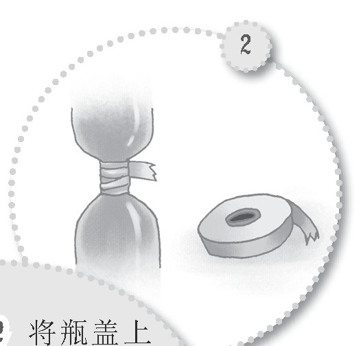 步骤2将瓶盖上打了孔的塑料瓶倒扣在装了水的瓶子上,然后用绝缘带缠住其连接处,避免瓶子漏水。