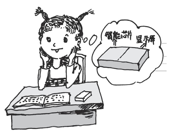 这种智能橡皮分为两部分,其中一部分是智能芯片,可以记忆上课时老师讲课的重点或老师布置的作业等内容;另一部分是一块小小的显示屏,可以把所记忆的内容显示出来,还有声音呢!另外,为了显示同学们所在的位置,我还给这块橡皮附加了一个定位功能,你若迷了路,这块橡皮就可以帮你大忙了。这可真是一物多用呀!