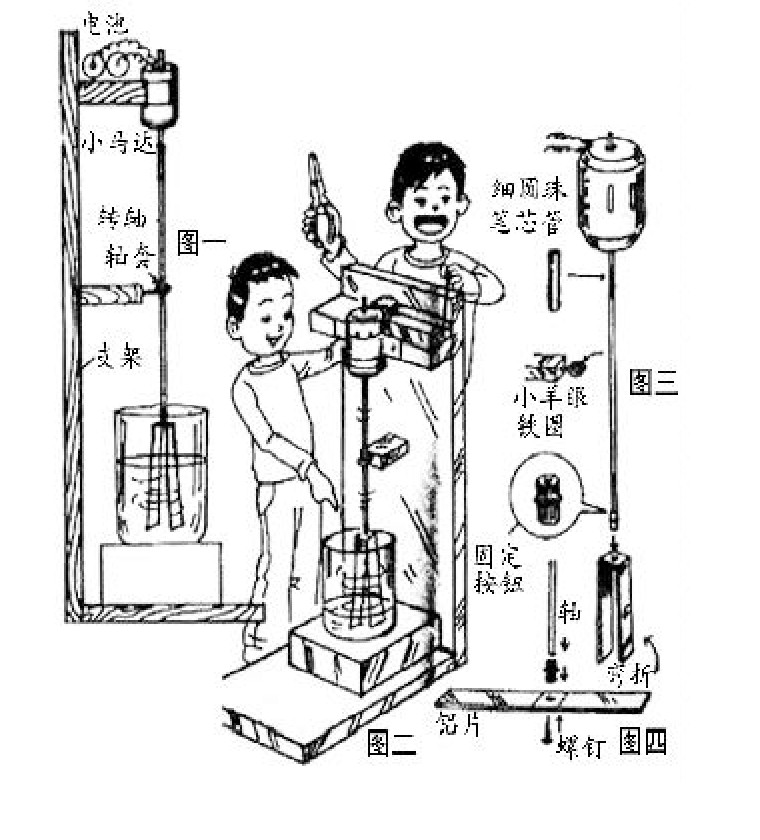 5.用电线把马达、电池盒和电源开关连接(见图二)。把盛液体的玻璃杯放在支架下端盘。