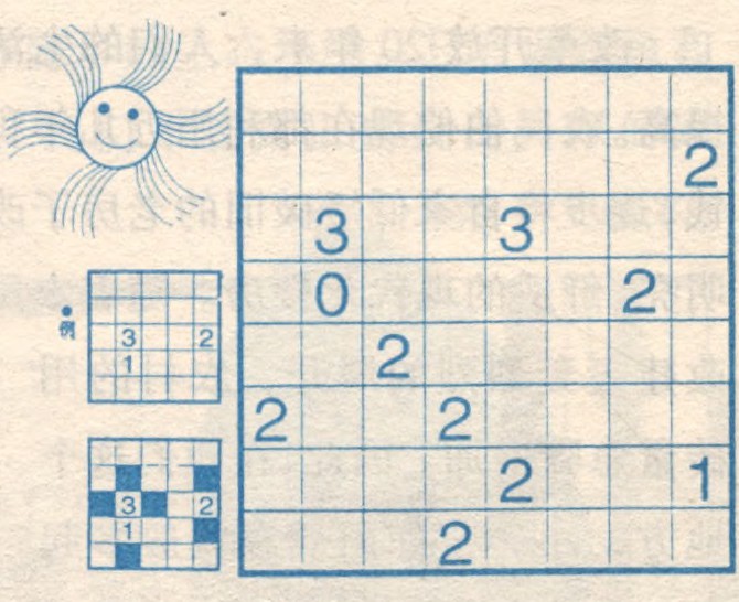 请你以例子的做法,凡是有数字的格子左右或上下相接的格子涂以数字表示的黑格数,你能办到吗?