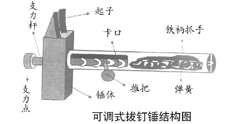 目前五金行卖的铁锤,一般都设有起子用于拔铁钉。但是这些拔钉锤最多只能起不超过3厘米的铁钉。如果铁钉长度超过3厘米,当铁钉拔到一定长度(约3厘米)时,就需要在铁锤的下端垫块木块,然后再将铁钉拔出。这样十分不便于操作,而且影响拔钉的速度。基于这一问题,我有了设计制作“可调式拔钉锤”的想法,以达到既可拔短铁钉又可拔长铁钉的目的。