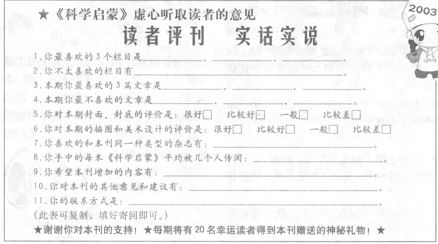 看过了 2003年1月经过全新改版的《科学启蒙》,感觉怎样呢?邓义元同学说得对,读者们的意见和建议对我们而言是非常重要的,只有真诚听取和采纳读者的意见,尽力满足读者的愿望和要求,《科学启蒙》才能真正做到越来越好!邓义元同学获得本期“幸运读者奖”是当之无愧,希望其他读者都能像他一样,拿起你手中的笔,认真填写每一份读者评刊表,并尽快寄给我们。我们每期将抽出20名幸运读者,将名单公布在杂志上,同时赠送神秘礼物一份。