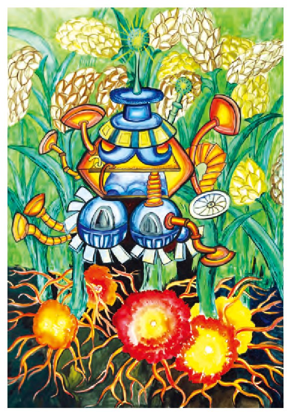 每到冬天,我就会被寒冷的天气困在家里,出不了门。我设想的这个转化机,可以自动搜寻周围的植物根茎,并通过无线微光传输照射,使其产生出强大的热能,从而使地面温暖起来。这样,只要有植物根茎存在的地方,地面都可以产生适合的温度,人们就再也不用担心冷气的侵扰了。