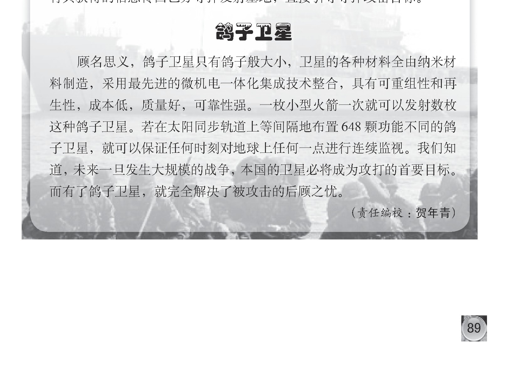 顾名思义,鸽子卫星只有鸽子般大小,卫星的各种材料全由纳米材料制造,采用最先进的微机电一体化集成技术整合,具有可重组性和再生性,成本低,质量好,可靠性强。一枚小型火箭一次就可以发射数枚这种鸽子卫星。若在太阳同步轨道上等间隔地布置648颗功能不同的鸽子卫星,就可以保证任何时刻对地球上任何一点进行连续监视。我们知道,未来一旦发生大规模的战争,本国的卫星必将成为攻打的首要目标。而有了鸽子卫星,就完全解决了被攻击的后顾之忧。