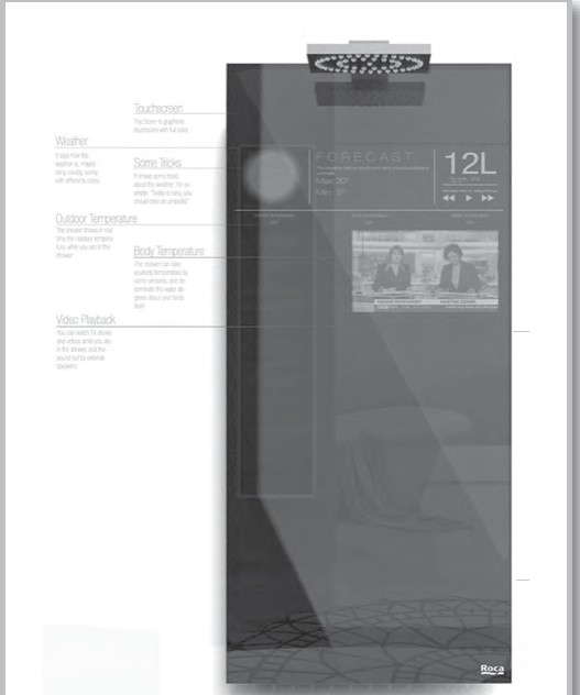 当人脱掉衣服,站在这个聪明淋浴器的莲蓬头下的时候,淋浴器里内置的探头会自动获取人体表的温度,把水温调控在让人觉得最舒服的程度,然后,“哗哗哗”,莲蓬头就自动流出水来了。而人一旦离开莲蓬头,淋浴器也会敏锐地察觉到,让水停止流出,而改从侧面喷水雾,维持周围的温度,直到你再次站到莲蓬头下面。另外,在莲蓬头下的屏幕上,人们还可以看到自己的用水量,收看天气预报和新闻等。这个淋浴器在加热、取暖、用水上都注重了节约,还把洗澡变成了一种十分有趣的享受。