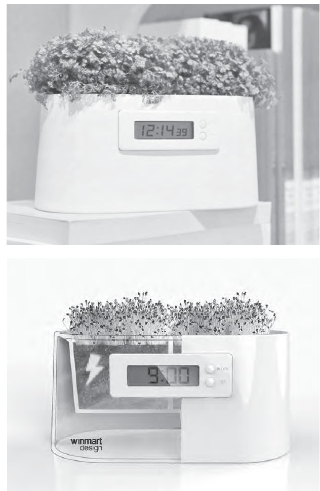 以前用电池看起来似乎也挺方便,可一颗换下来的废电池,如果处理不当可能会污染60万升水,这几乎是一个人一生的饮水量呢。在生产、处理等环节中,电池从来就不是个省事的家伙。植物电能闹钟看起来就是个白色的小花盆。只要在里面种上小小的植物,比如珊瑚蕨,然后浇上水,时钟就开始工作了。原来植物土壤里插有不同的金属条,而浇进去的水里含有氢离子。这些金属条容易被氧化,氢离子会趁机附着在金属条上,形成小小的电流,供时钟工作。植物电能时钟还能吸收废气,减少辐射呢。