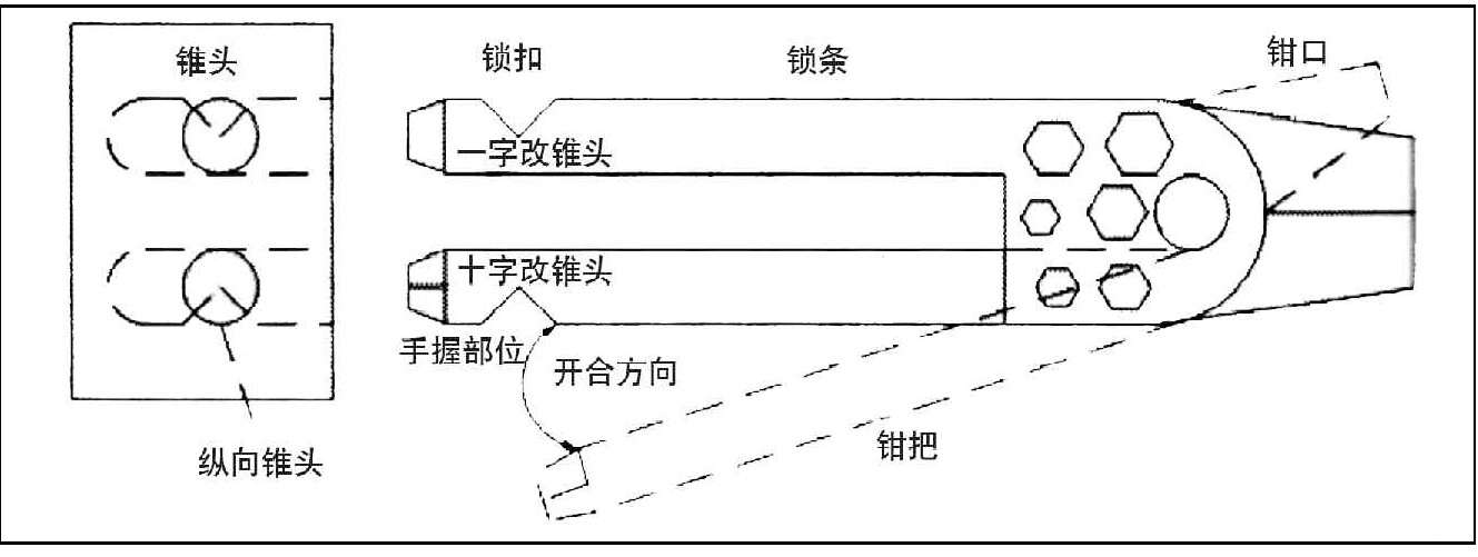 首先将两个锁扣头分别改造成一字改锥和十字改锥,然后将一块布满不同大小螺钉孔的铁片添加到U形插锁底部当扳手使用,最后为了实现老虎钳的功能,将两条锁条做成活扣,使之成为老虎钳的两个把手,然后再U形锁条底部加上钳子作为老虎钳口。这样一来,多功能自行车锁就做好了,不但设计制作简单,携带使用方便,而且成本很低,很适合大力推广。