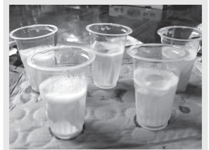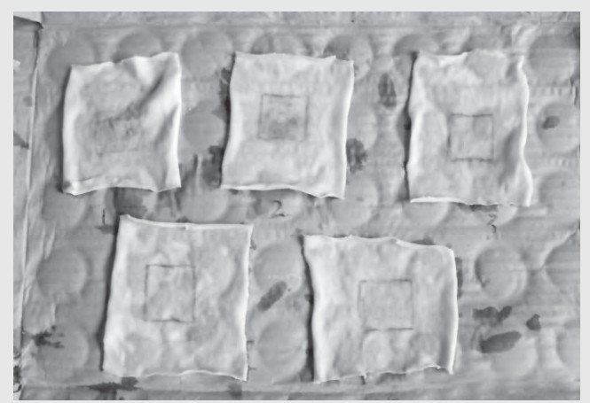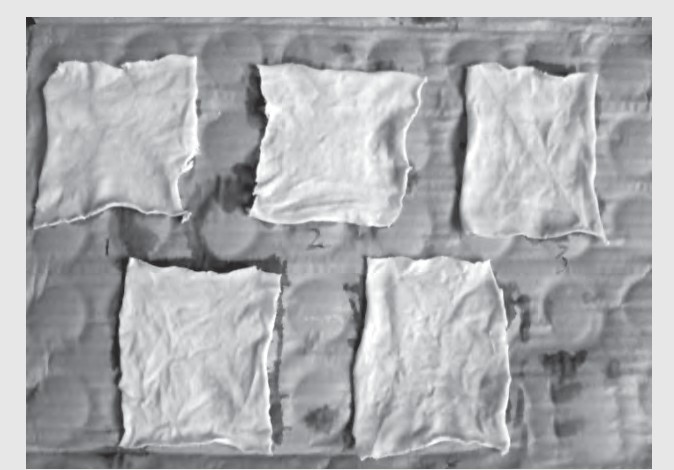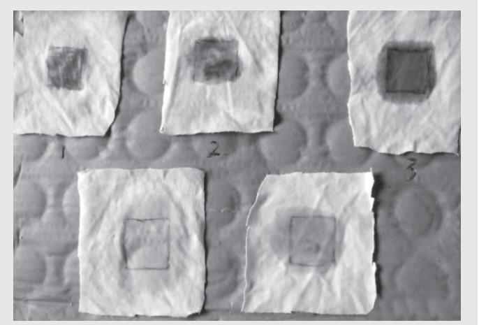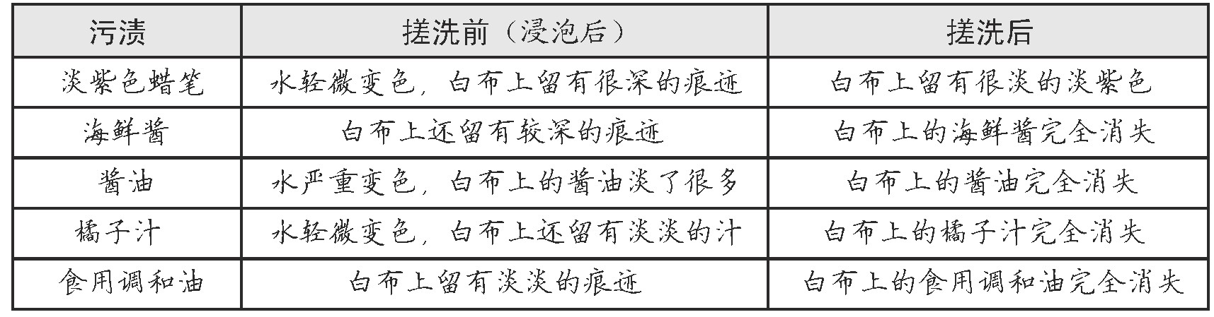 我找来了一个大盆子、五个透明塑料杯和一件旧的白色衣服,然后往大盆子里倒了约1 000毫升水和25克洗衣粉,用筷子将洗衣粉搅拌均匀后,我在五个塑料杯中倒入等量的洗衣粉溶液。接着我从白色衣服上裁剪下五块大小一致的布,在上面画上一个边长为两厘米的方块,以便控制污渍的大小。最后,我把生活中常见的污渍,如酱油、食用调和油、海鲜酱、淡紫色蜡笔和橘子汁涂在方块中,再分别放进塑料杯里,浸泡20分钟后,进行搓洗。