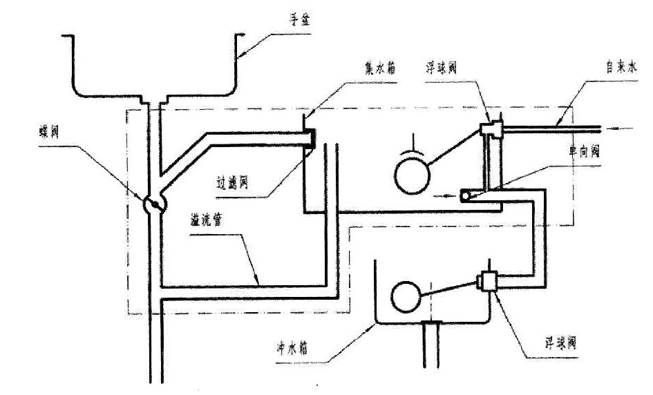 该装置的工作原理如图所示。关闭蝶阀,洗手盆中用过的废水,经过V形管进入集水箱。水箱中的水位提高,推动球阀关闭自来水的供应,此时,只能由集水箱中的废水向马桶供水。一旦水盆中断废水供应,而且集水箱中废水已用光,浮球阀就会下落,导通自来水,向马桶水箱供水。而此时由于止回阀的阻断,自来水不能进入集水箱,使集水箱仍保持空的状态。当洗手盆恢复供水时,浮球阀再次被推动,关闭自来水,由集水箱向马桶供水。