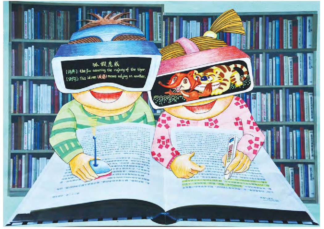 我设计的这款VR智能学习眼镜,配有专门的手持扫描仪和微型翻译器。只要拿着手持扫描仪对着书本上的文字轻轻一扫,文字立刻就会变成生动有趣的动画,瞬间就能提升阅读的趣味性;而微型翻译器就更厉害了,它可以实现全世界多种语言的互译,是学习外语的最佳帮手。