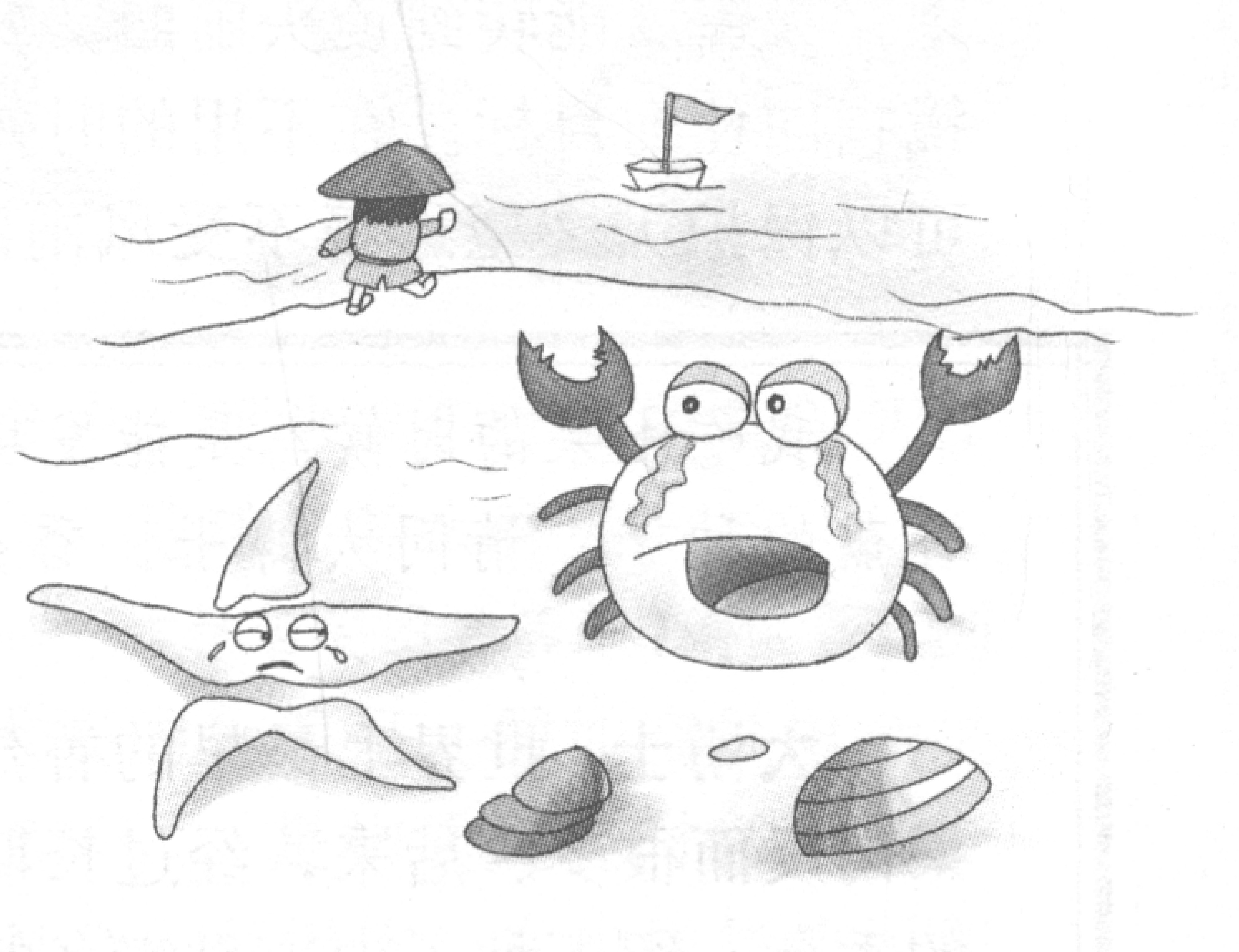 1.(螃蟹在沙滩上玩,看见渔民们把海星剁成了三四块,看着海星很疼的样子,螃蟹伤心地哭了。)