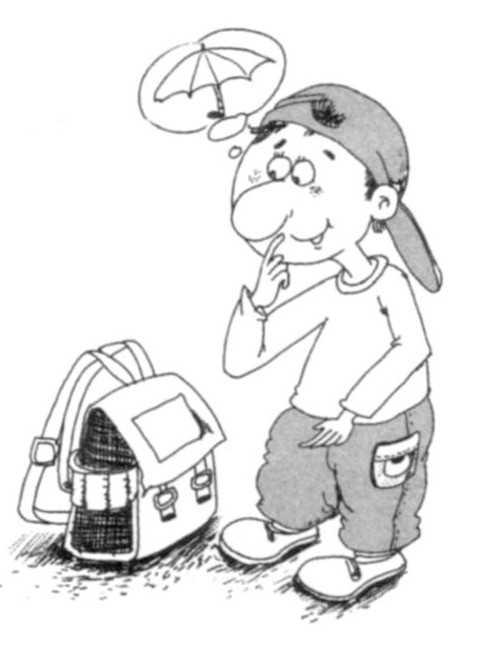 包是我们常用的,书包、钱包、旅行包。先把一个包包设计成内外两层,包带子用可随意弯曲变形的软塑料。平时,这包纯粹用来装东西,到了下雨天,只要把内层提出来,外层的袋子就成了伞面,包带子成了伞柄,一拉一撑,一把伞就出现了。如果躲雨的人多,这伞还可以扩大,因为它本身就是一层层折叠的。雨停了,随手收好,这伞又成了方便的包。怎么样,我这发明有意思吧?