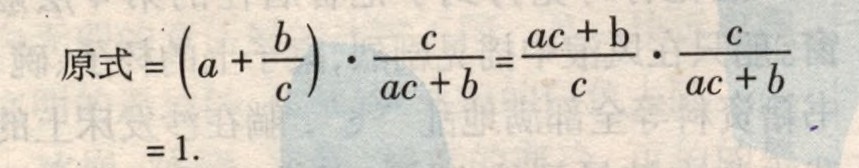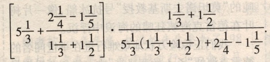 此题虽可用小学学过的分数知识来解,但繁且难。如果注意到计算式中的数的特征,并将数与式类比,分数与分式类比,则可简捷求解。设51/3=a,21/4-11/5=b,11/3+11/2= c 则