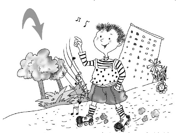 为什么一点儿也不累呢?因为我发明的这种鞋,有自动滑轮。在走累了的时候,它能自动感知并启动滑轮功能。当滑轮从鞋底弹出后,利用你以前走路时储存的能源,带着你向前走,真是一款逍遥鞋。