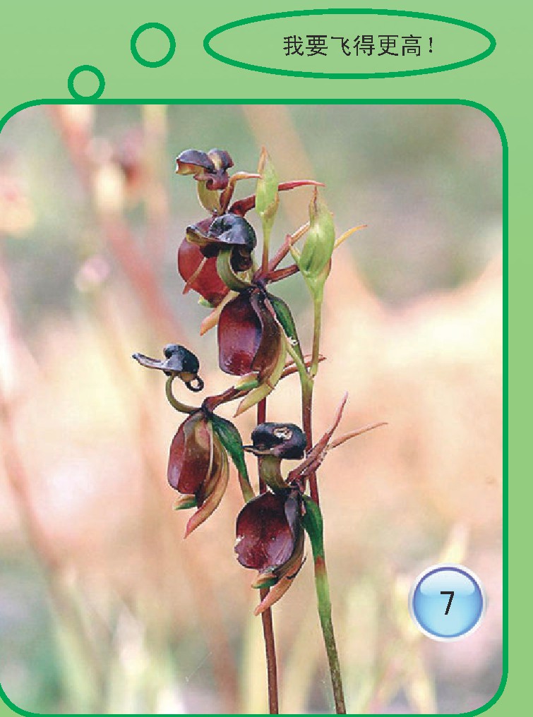 谈到澳大利亚,许多人想到的是无尾熊、鸭嘴兽等,然而大家并不知道,这儿居然有一种长得像鸭子的兰花。这是澳大利亚特有的兰花——飞鸭兰。花儿的侧面像一只只凌空飞起的小鸭子,头和嘴都惟妙惟肖,甚至颜色也一样,令人不禁赞叹造物者的神奇。