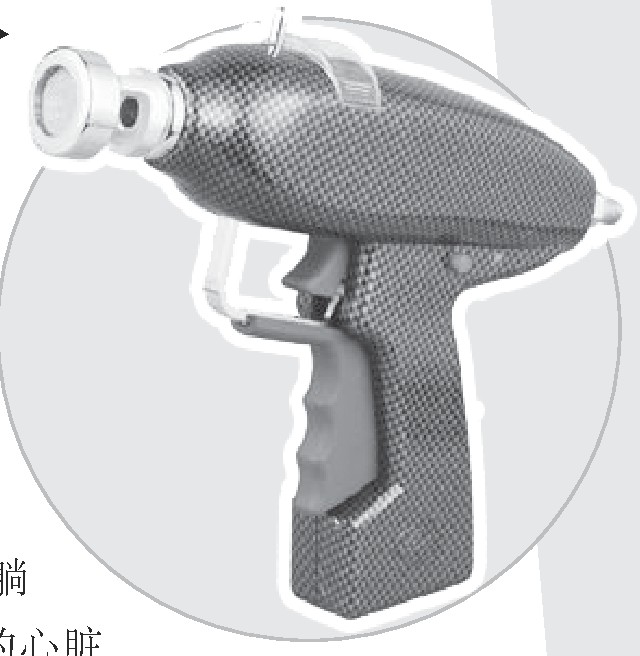 20世纪90年代末,德国科学家研究出一种治疗心脏病的治病枪。这种枪的外形跟普通手枪相似,它的治疗功能与医生的手术刀具有同样的效果,可将1 000瓦的能量进行脉冲发射。当心脏病患者需要进行手术治疗时,只需平躺在床上,无需打麻药,手术医生只要手拿治病枪对准病人的心脏部位射入子弹,子弹迅速穿透心脏,在需要手术的地方留下一个细小的通道,建立一个新的微循环机构,在确保心肌功能正常运行的同时,子弹很快进行了心肌血液输送的重建,使心脏的供血系统恢复如初,解除了冠心病患者的痛苦。