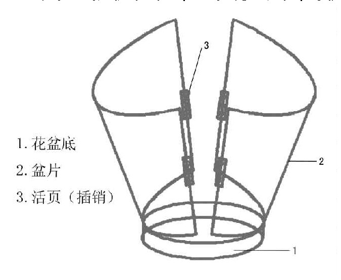 这种花盆的材质为塑料,结构可拆分成三个部分(如图所示),分别是一个盆底座和两个盆片,三者之间通过活页插销紧紧地结合在一起。这种可拆装花盆平时可当普通花盆使用,移栽时,先松开两边的插销,即可将花盆分为两半,方便移出花苗而不损伤根部,大大减少了花苗在移栽过程中受损和打烂花盆的情况。