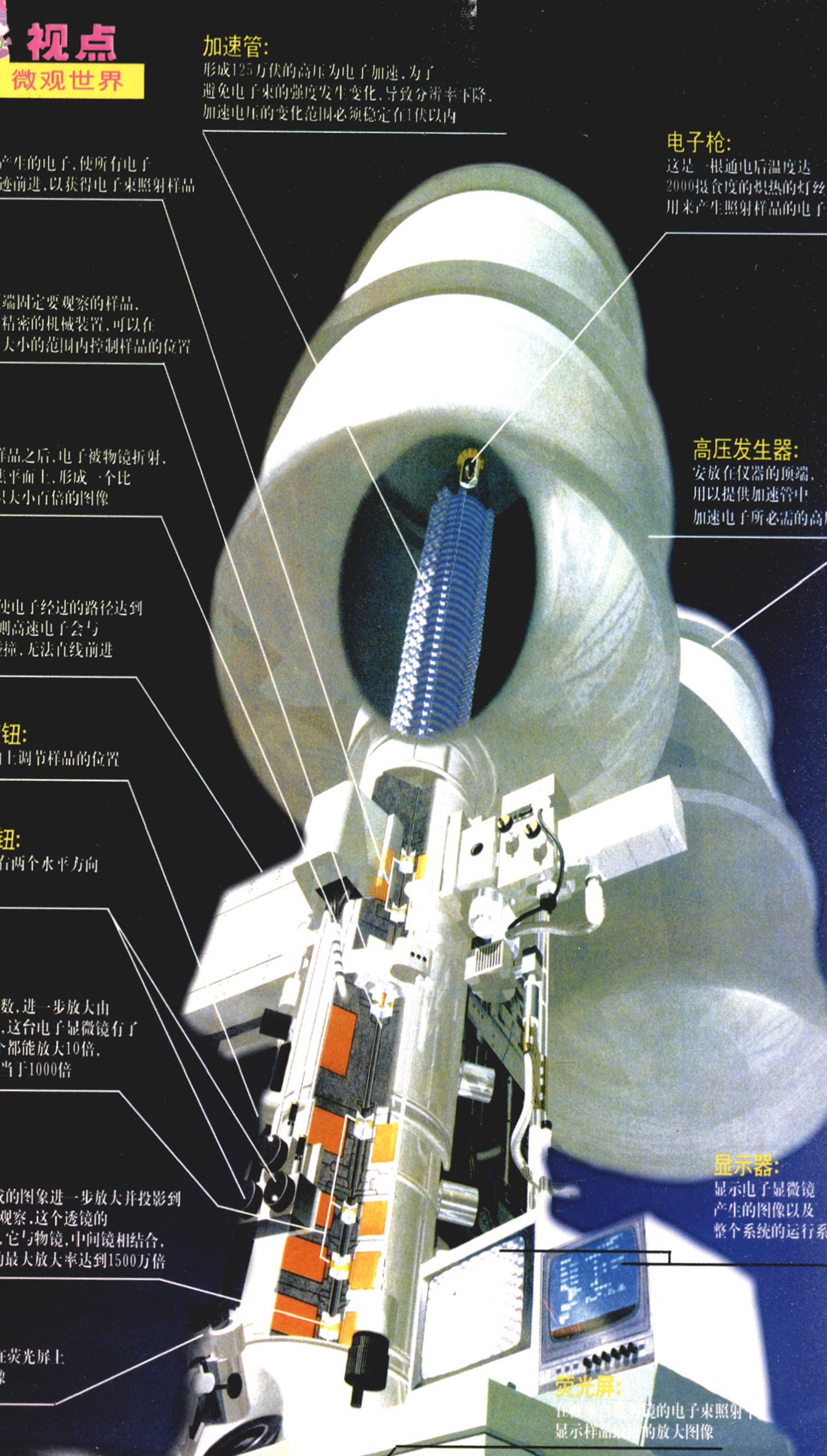 加速管:形成125万伏的高压为电子加速,为了避免电子束的强度发生变化,导致分辨率下降,加速电压的变化范围必须稳定在1伏以内。