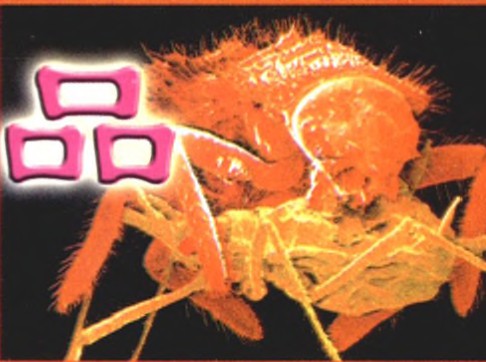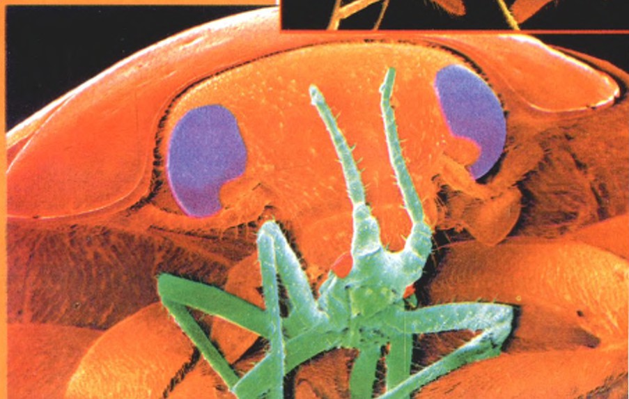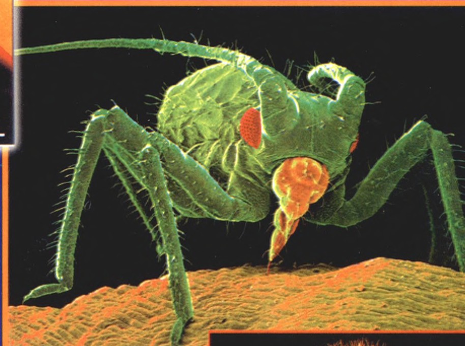 菜豆叶子上饱餐的蚜虫,注意它的栗色吸管,正从植物中吸收养分。而下面是正在大嚼蚜虫的七星瓢虫,在显微镜下纤毫毕现。