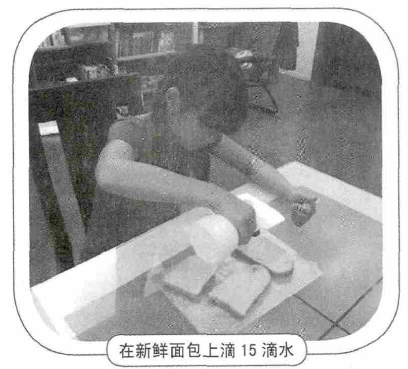 首先,我准备在三片面包上培养霉菌。黑麦面包是我的首选,因为这类面包比较容易滋生霉菌。接着,我用滴管在每片面包上滴15滴水,再装进食品塑料袋密封起来。