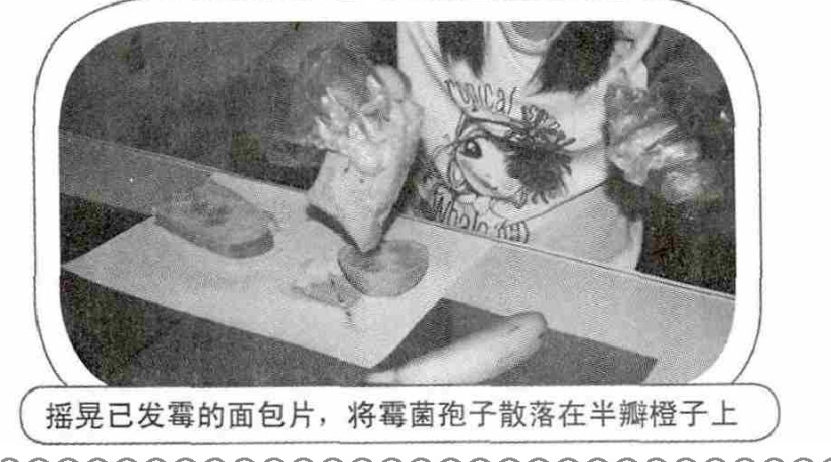 摇晃已发霉的面包片,将霉菌孢子散落在半瓣橙子上