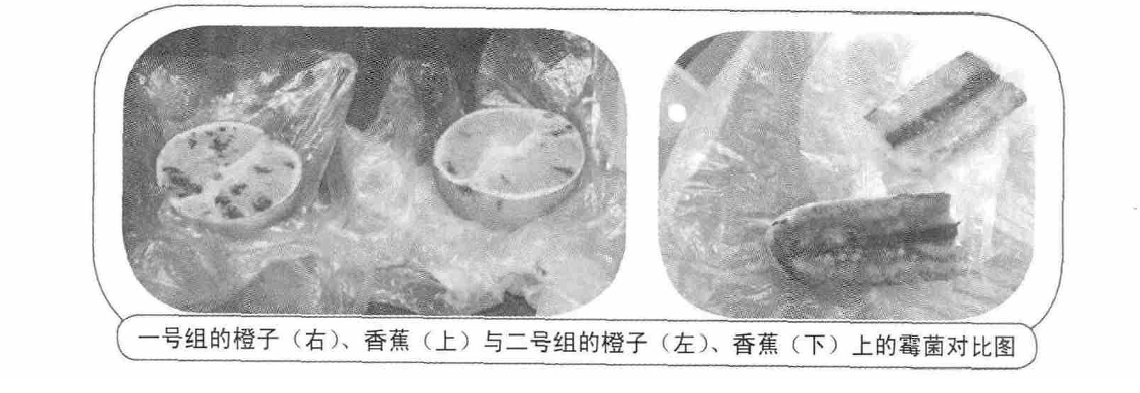 一号组的橙子(右)、香蕉(上)与二号组的橙子(左)、香蕉(下)上的霉菌对比图