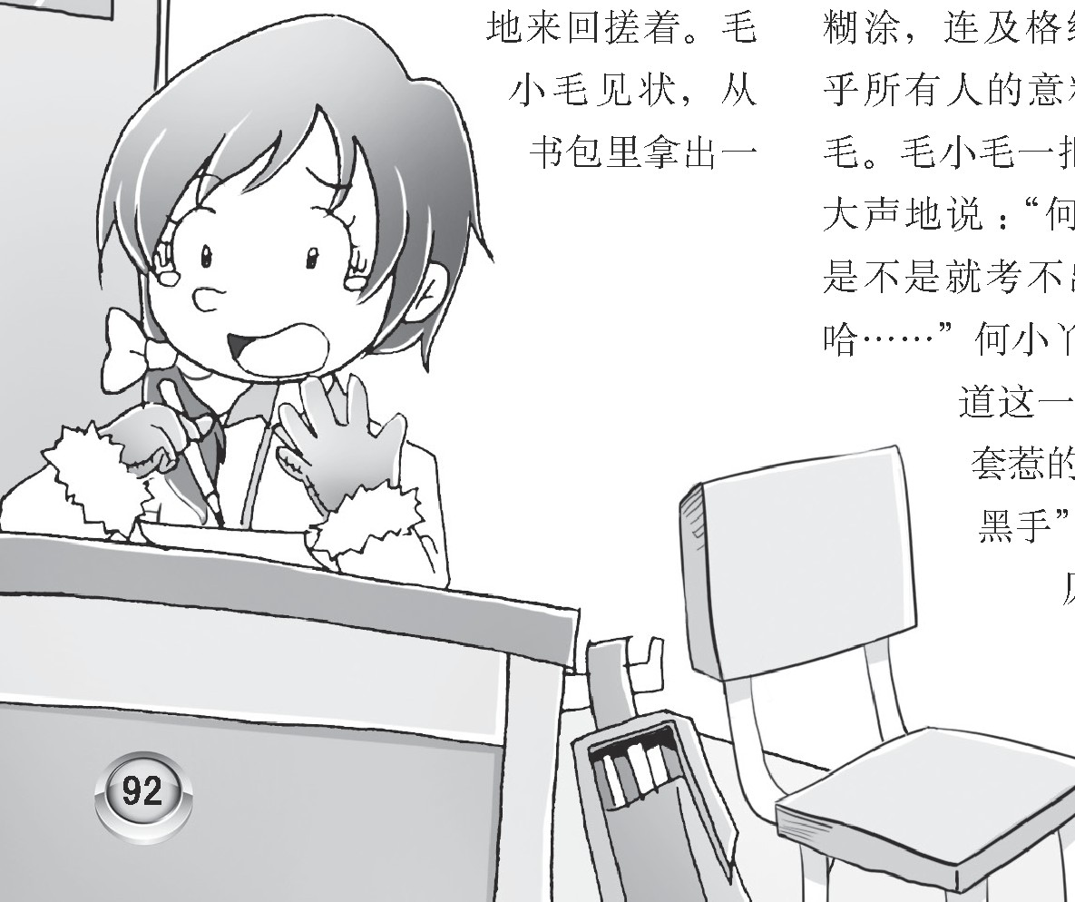 何小丫的成绩毫无悬念地一塌糊涂,连及格线都没过,这完全出乎所有人的意料。当然,除了毛小毛。毛小毛一把抓起何小丫的考卷,大声地说:“何小丫,不涂指甲油,是不是就考不出好成绩来了啊?哈哈……”何小丫羞得满脸通红,她知道这一切都是那双可恶的手套惹的祸,而真正的“幕后黑手”就是毛小毛。