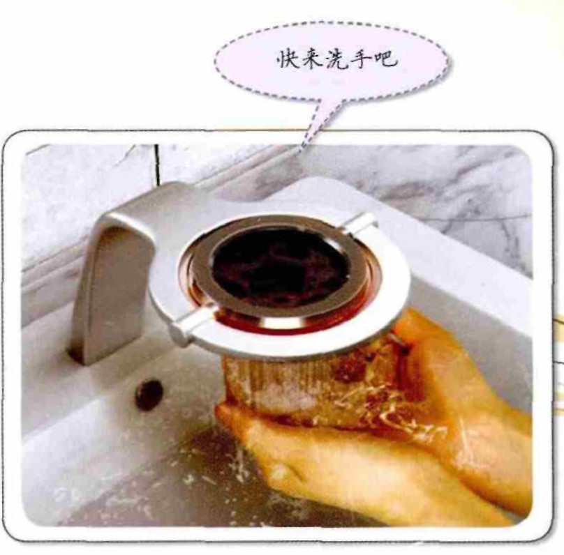 如果对"手是否洗干净还存在疑问的话,那就快来找我吧——“我洗”智能水龙头。从外观上看,我和一般感应水龙头没有太大区别,只是造型变成了大圆盘的花洒状,我的圆盘最外层有一圈密集的出水孔,当你的小手靠近时就会自动感应出水。