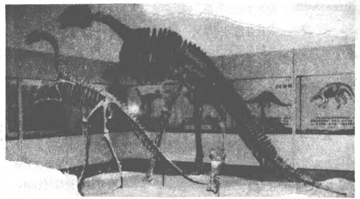 原来,中外古生物科学家,对二连地区的古生物考察至今已有一个多世纪的历史,其间大量的珍贵化石被发掘出土。为让人们了解和学习生物进化过程,“中国二连恐龙博物馆”应运而生。这是当今世界著名的恐龙化石宝库。馆内整齐有序地陈列着二连地区出土的许许多多中生代恐龙和恐龙蛋化石、古代海洋动物和新生代哺乳动物化石。两具巨大而完整的白垩纪恐龙装架,昂首高高地竖立在展厅的正中央,栩栩如生的特有雄姿(如图),像是在热情地欢迎友好的人类朋友,常年累月吸引着众多的参观者。