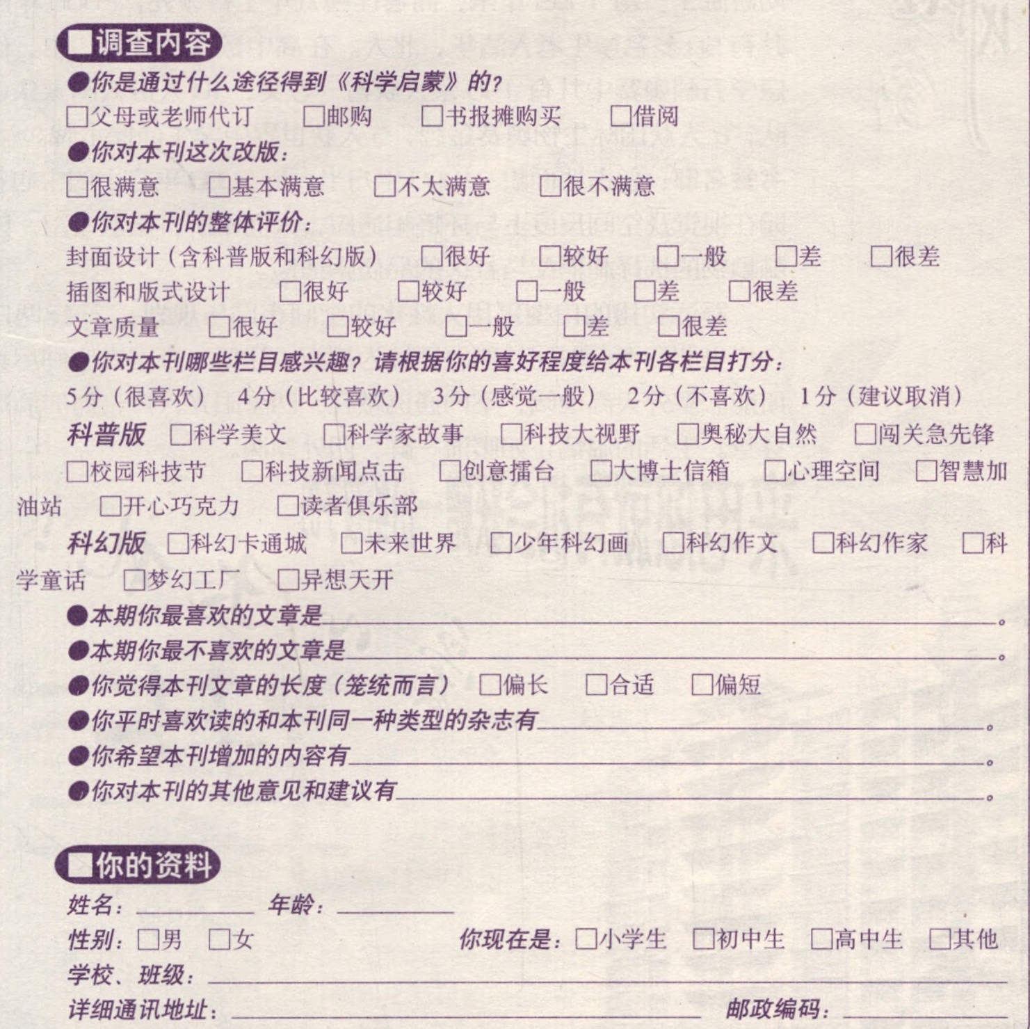 为了使《科学启蒙》更加贴近读者,请你认真填写读者调查表,将你的宝贵意见告诉我们,以帮助我们更好地了解你的阅读兴趣,满足你的需求。