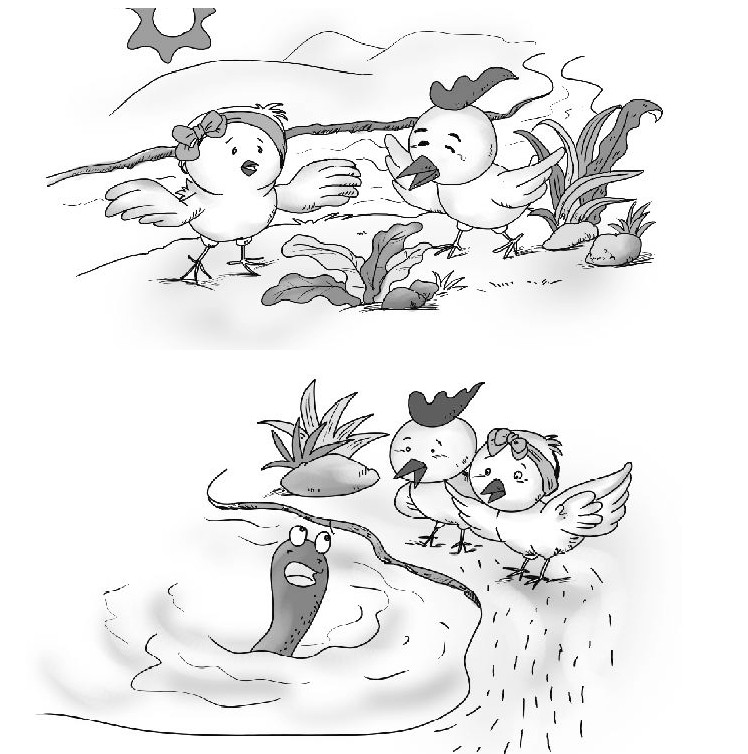 2.(大泥鳅从水里探出头来,对小公鸡和小母鸡说话,很焦急的样子)