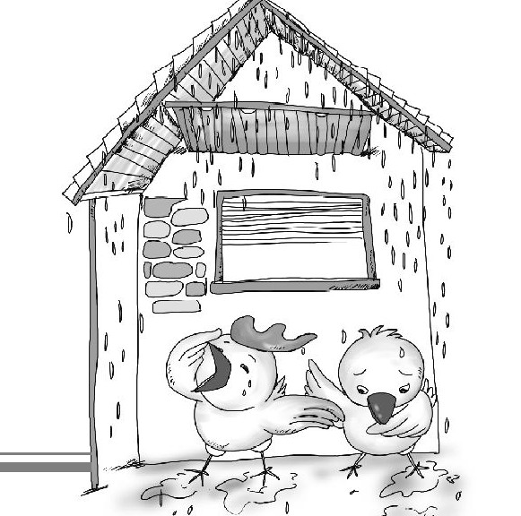6.(小公鸡和小母鸡浑身都是泥,很狼狈地站在屋檐下)