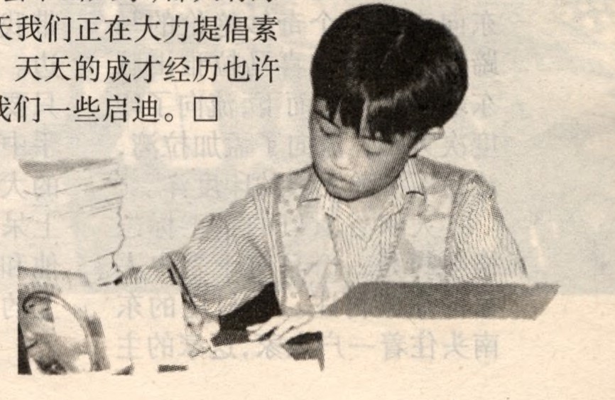 为什么9岁的构思,14岁才真正出书呢?是因为天天写作不畅吗?谈到这一点,天天的父母大有感慨。他们说:“如果不阻止和扼杀孩子对文学创作的爱好,天天出书绝不会是14岁这个年龄! ”当小学一年级的天天忙着在她的方格本、草稿纸上写写划划的时候,当孩子认认真真地告诉父母要写“好长好长的一大本小说”的时候,爸爸一看那些手稿乐了:这哪成啊,一句话中10个字能错5个!父母开始对小天天叫停了,可她还是往前写,眼瞅着都写七八万字了。父母很担心,心想:照这样下去,不耽误孩子功课嘛!不行,说什么也不能让她写下去了。如果真有创作天赋,考上大学以后再写不迟啊!有一次,小天天数学考得不好,一气之下,妈妈把她一摞厚厚的稿子全部撕掉了,勒令她再也不许写什么小说。事后想来,小天天当时的无奈真是难以言说。提起这事,天天的父母总结说:“对有特殊天分的孩子真应该特殊对待和培养,这对孩子的健康成长和发展,对社会早出人才,都大有好处! ”今天我们正在大力提倡素质教育,天天的成才经历也许能带给我们一些启迪。□