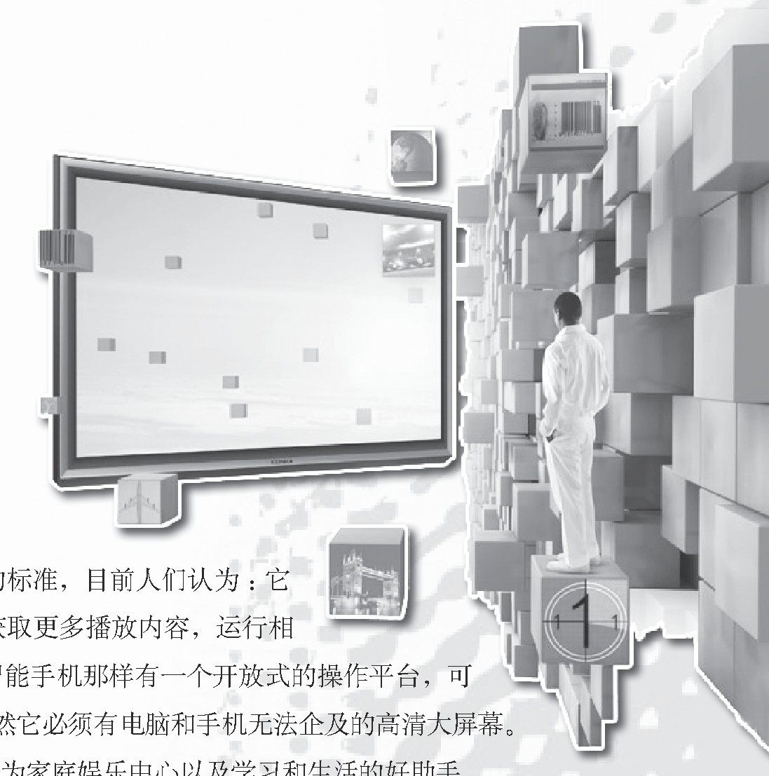 智能电视尚无一个统一的标准,目前人们认为:它既能像电脑那样上网冲浪,获取更多播放内容,运行相应软件;又能像现在流行的智能手机那样有一个开放式的操作平台,可以自由下载无数应用软件;当然它必须有电脑和手机无法企及的高清大屏幕。它顺应三网融合的趋势,将成为家庭娱乐中心以及学习和生活的好助手。