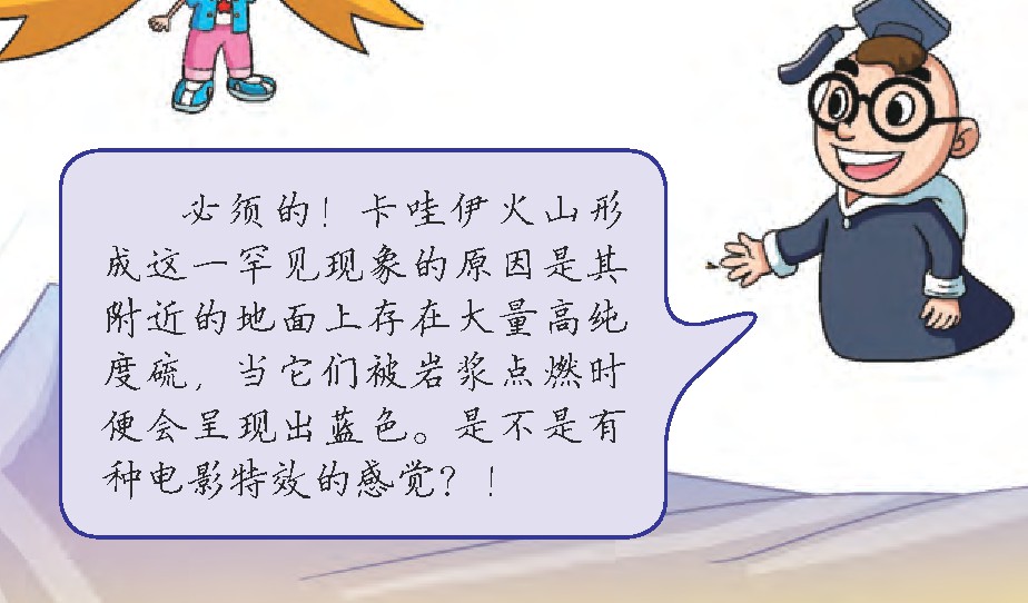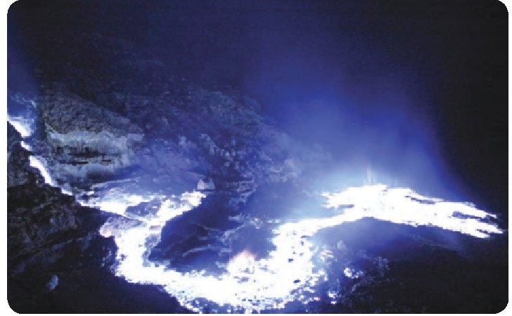 如果你觉得“喷冰”“喷金吐银”还不够精彩的话,那就去印度尼西亚吧!那里的卡哇伊火山喷出的蓝色岩浆绝对能够震撼你的眼球。当火山爆发后,大量蓝色岩浆流出地面,形成了一片蓝色的“海洋”。