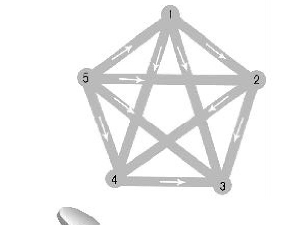 在左边这个五边形迷宫里,每条边只能沿一个方向走。你能找出一条可以一次经过这5个点的路吗?