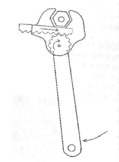 我把由两个接触面改成四个接触面的扳手拿给修理工人试用,工人们都说好用,用过的师傅都称赞这种改进构思巧妙,效果很好,改进后的扳手确实不易拧坏螺丝,尤其拧一些规格特殊或已被拧得变形的螺丝更是得心应手。对于带有灵活柄的新型活动扳手,由于受制作条件的限制,暂时只能提供模型。如果把改进后的扳手的四个接触面加上一些齿纹,这种新型的活动扳手还可以代替管钳使用。