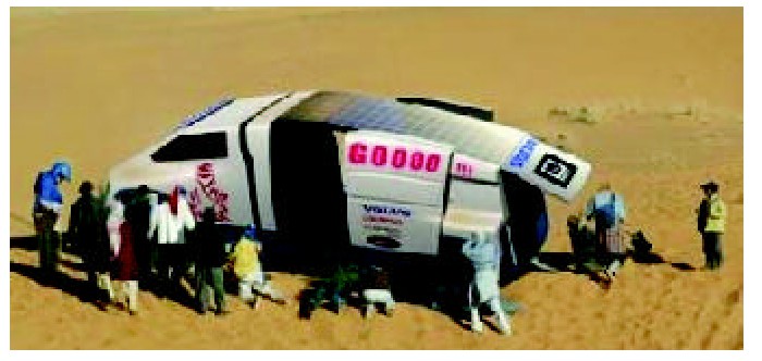 图中的这款沃尔沃将问世于2015年达喀尔汽车拉力赛之前,采用太阳能、燃料电池和柴油发动机“三管齐下”的动力系统。迄今为止,这款沃尔沃可能是体积最大同时也最为拙劣的太阳能概念车。