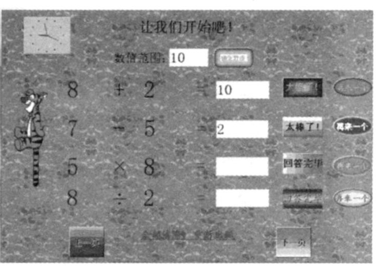 图(1)是开始页,单击“开始做题”即可进入主程序。如图(2)所示,首先设定数的范围,设定好以后,按“确定数值”按钮,页面更新,即可开始答题。答案正确,提示“太棒了”,老虎跳动。答案错误,提示“很遗憾”,老虎不动。可以整套题更新,也可以单个题更新。