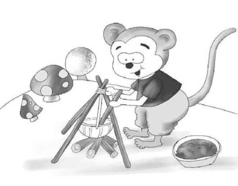 1.(小猴子架起柴,支起锅,生起火,准备炒栗子。)